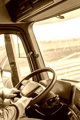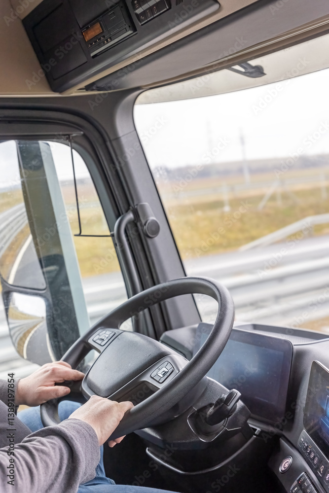 Driver inside the cab of a moving truc closeup. Vertical. All potential trademarks are removed.