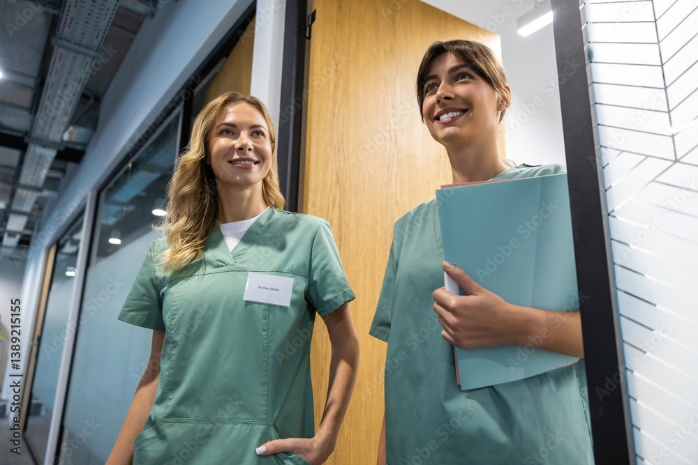Female physicians standing in hospital corridor discussing patient diagnosis