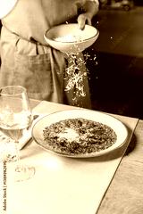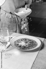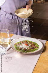 Freshly grated parmesan falling over a green risotto dish with duck breast, served with white wine in a fine dining restaurant