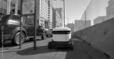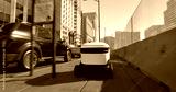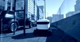 Autonomous delivery robot moves swiftly through a busy city sidewalk, navigating urban infrastructure with smart technology in a modern logistics environment