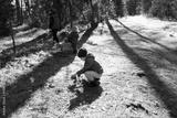Children explore forest floor while foraging during autumn afternoon in a tranquil woodland