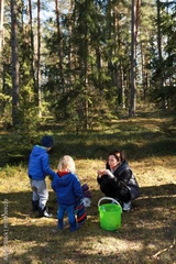 Mother and children enjoy a nature outing in a forest during a sunny day while gathering materials for a fun activity