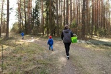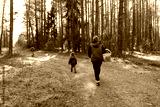 Family enjoying a nature walk in a forest during daytime with a child and a dog