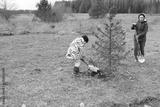Children participate in tree planting activity in a grassy field during a cool afternoon in springtime nature