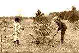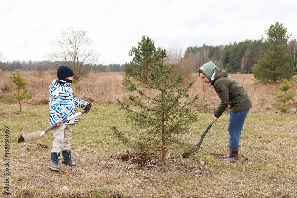 Children planting a tree in a rural area during early spring, embracing nature and environmental stewardship
