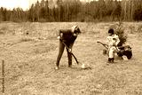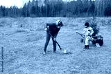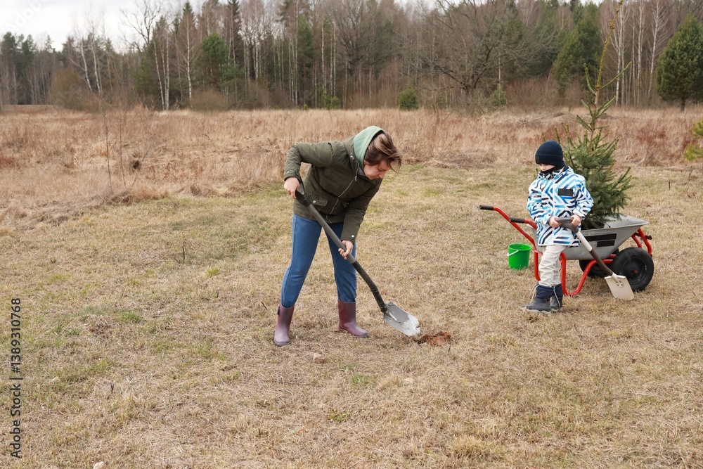 Mother and child gardening together in a meadow during early spring, planting a new tree in a rural area