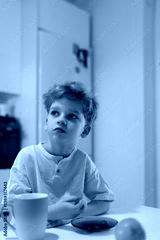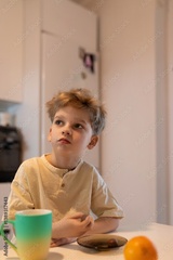 Young boy enjoys breakfast at home in a cozy kitchen on a sunny morning