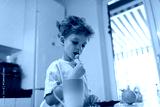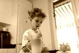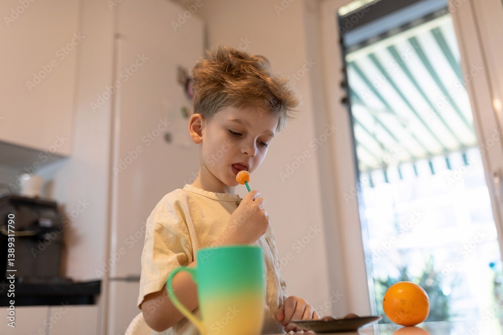 Young boy enjoying a fruit snack while standing at a kitchen counter in a bright home setting