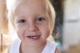 Smiling toddler with bright blue eyes enjoying playtime indoors during daytime
