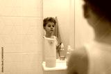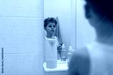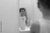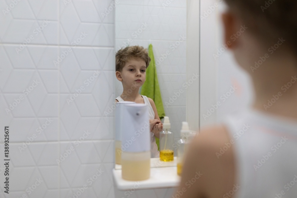 Young boy gazes thoughtfully at his reflection in bathroom mirror during morning routine