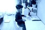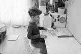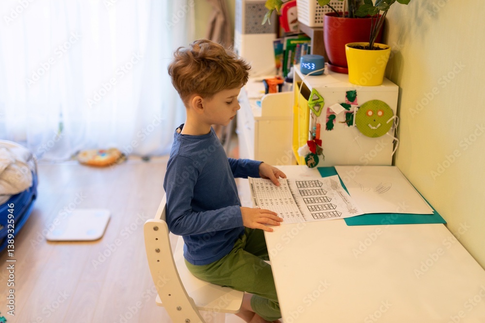 Child engaged in learning activities at a bright and colorful room during afternoon hours, focusing on educational materials