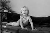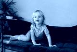 Joyful child playing on couch in cozy living room with plants in the background during sunny afternoon