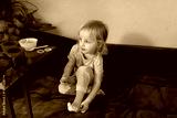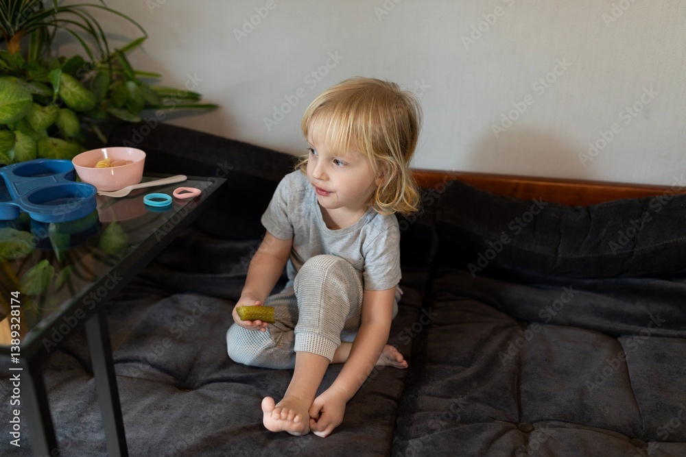 Child enjoying snack on cozy couch in a bright room with indoor plants while seated at glass table