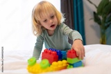 Child builds colorful structures with blocks on a bed in a cozy indoor setting during the afternoon