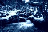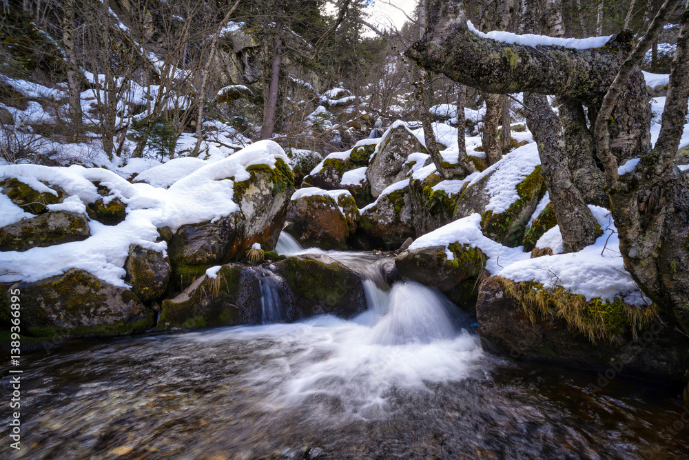 Mountain river waterfall in snow. Snowy river waterfall