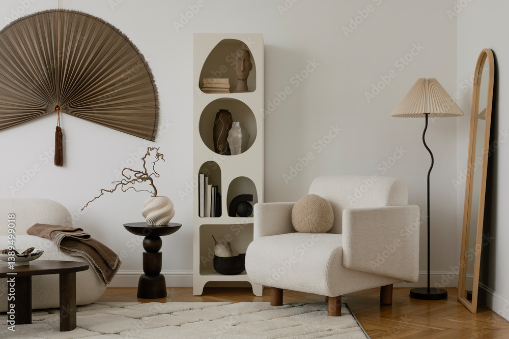 Neutral living room with soft furnishings, abstract shapes, and sculptural coffee table styling...
