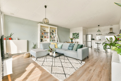 A stylish modern living room featuring a cozy sofa, vibrant plants, and a well-organized bookshelf, creating an inviting ambiance for relaxation.
