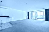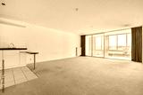 Spacious living room features large windows, beige carpet, and a minimalist kitchen setup, providing a bright and airy atmosphere.