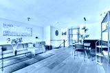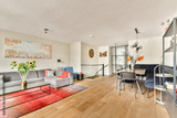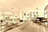 A stylish modern living room featuring a cozy sofa, elegant decor, and a dining area. The warm color palette and natural light create an inviting atmosphere.