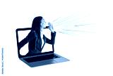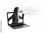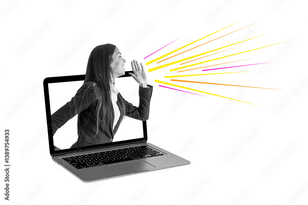 Businesswoman shouting from laptop with colorful lines, isolated on white background, concept of online communication and digital promotion