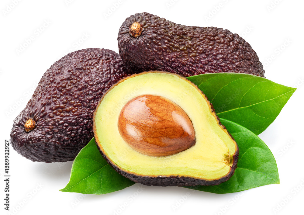 Hass avocado fruits and halved avocado with leaves isolated on white background. File contains clipping paths.