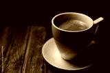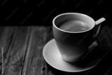 Aromatic strong coffee on the table. White Cup with Coffee on a Black Background