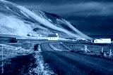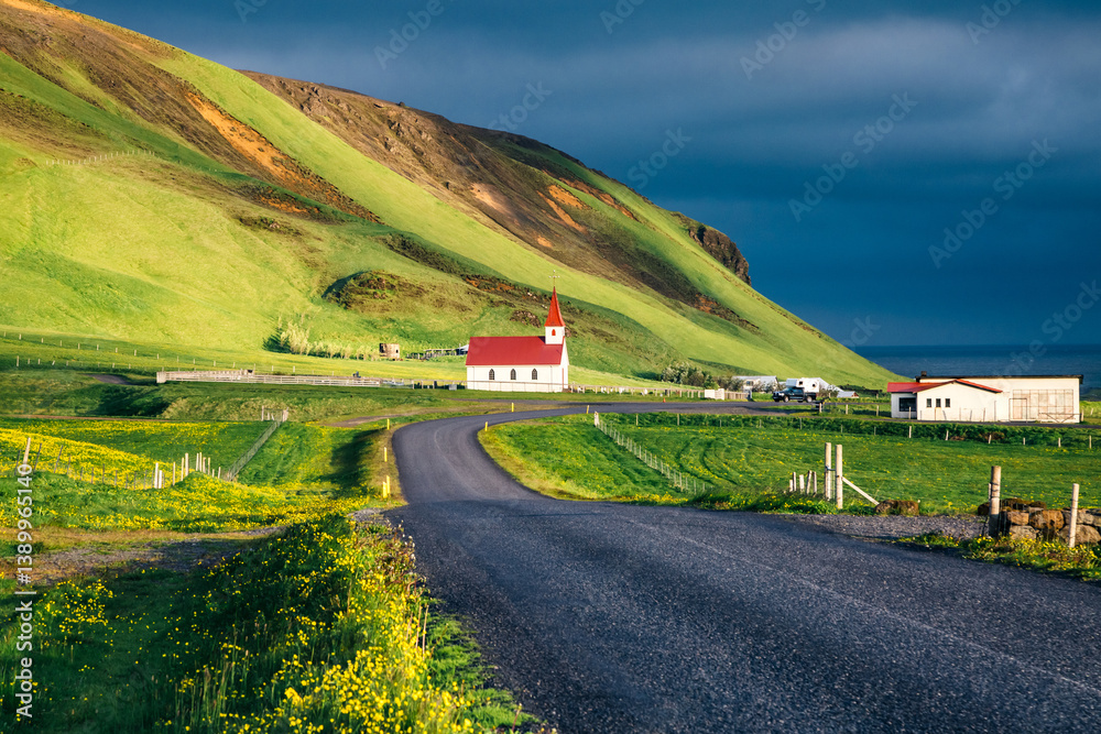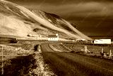 Typical Icelandic terrain with a road stretching through the mountains to the ocean. Location place Iceland, Europe.