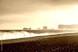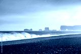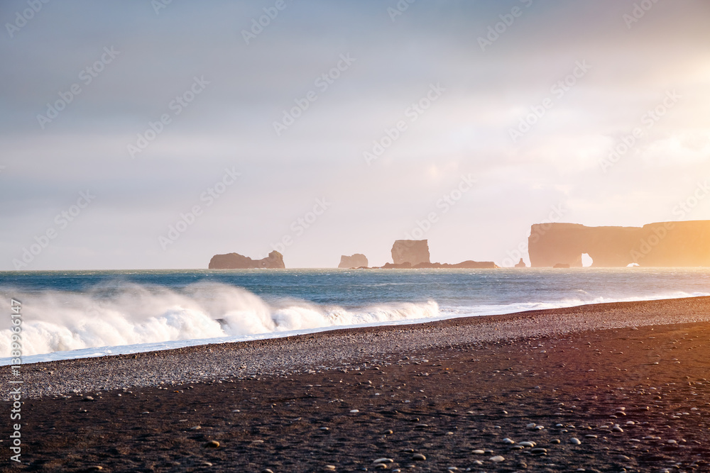 Powerful waves crashing onto a Reynisfjara black sand beach with a view of Cape Dyrholaey. Location place Vik I Myrdal, southern Iceland, Europe.