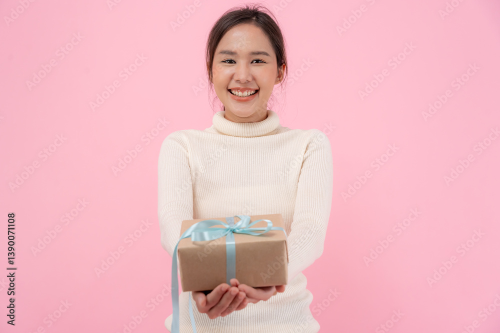 Pretty asian woman feel surprise and look interest gift box. cute girl excited open gift box. birthday, Celebration, xmas, New year Festival, thank, Celebrate, Valentine's Day, Anniversary
