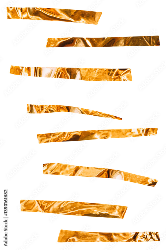 Collection of thin wrinkled golden foil tape strips on transparent background. Glossy reflective ribbons with crumpled texture for design elements..