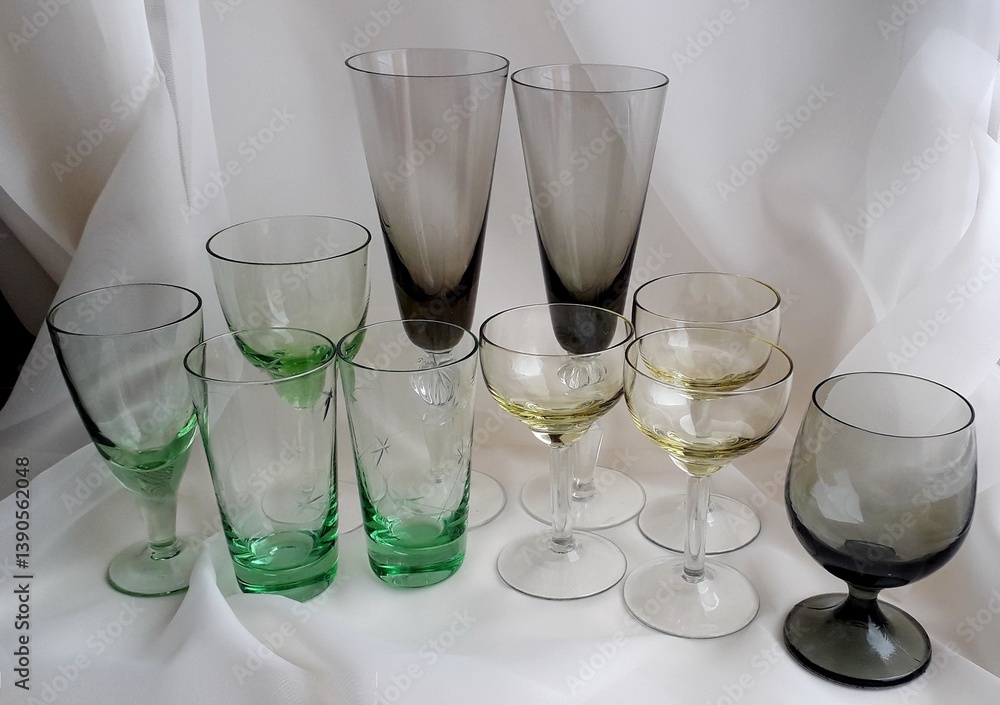 Vintage colored glassware. Colored wine glasses on a light background. Green, burgundy old glassware. Vintage goods.