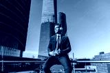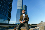 Businessman listening music with headphones in cuatro torres business area, madrid