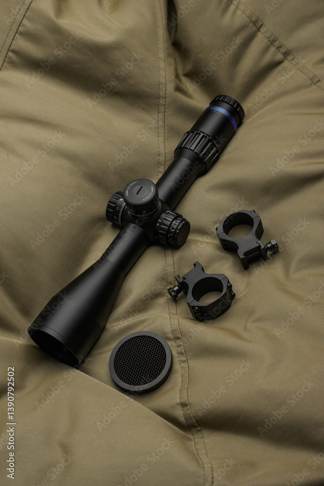 A black rifle scope with adjustment knobs, mounting rings, and a honeycomb filter placed on a textured khaki fabric surface.