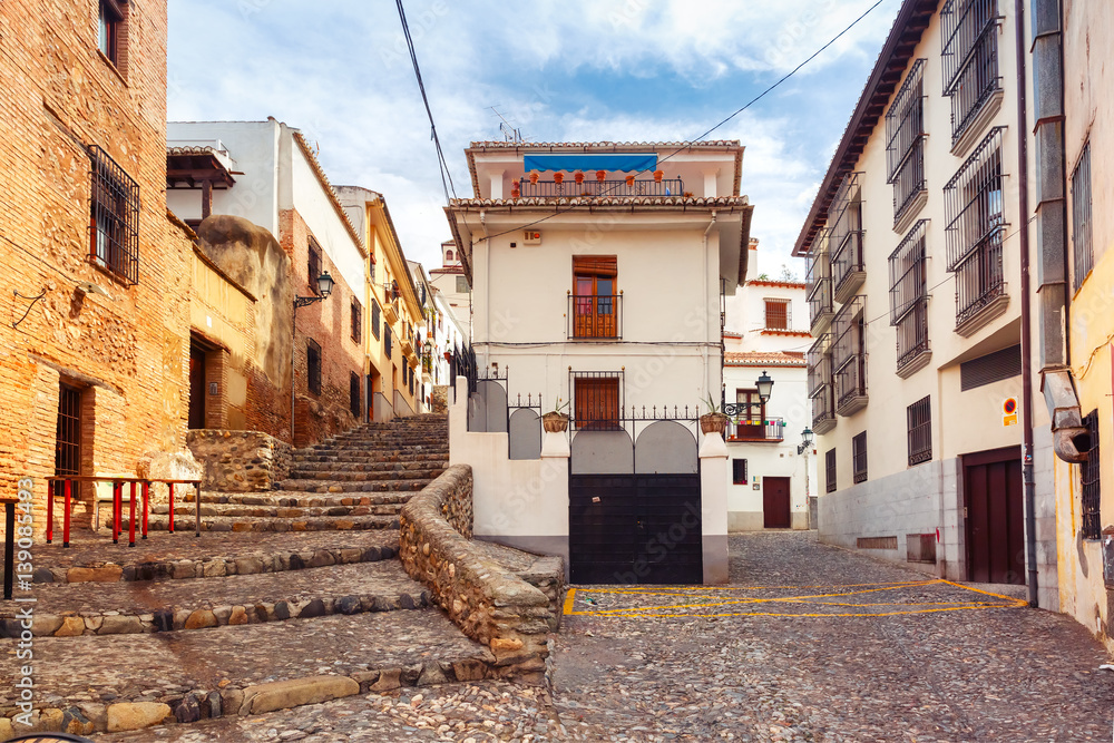 Scenic alley with traditional Spanish white houses in the old town area of Albaicin, Granada, Andalusia, Spain