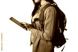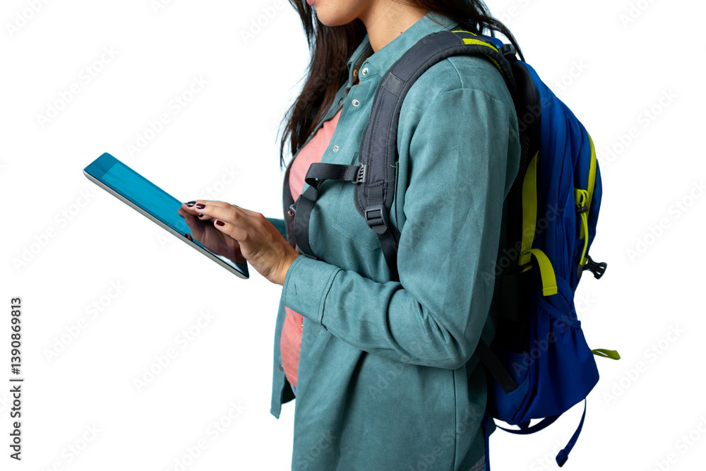 Woman traveler browsing digital tablet, wearing backpack against transparent background