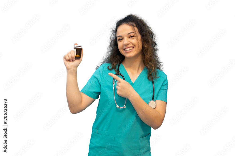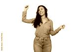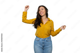 Youthful female joyfully dancing, listening to music against transparent backdrop
