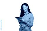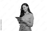 Young woman in yellow shirt browsing digital tablet, long brown hair flowing, transparent backdrop
