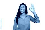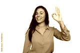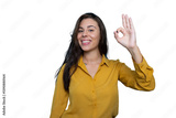 Young businesswoman smiling and gesturing okay sign, isolated on transparent background