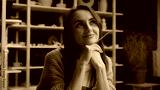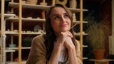 Thinking thoughtful woman Caucasian girl smile female designer artist painter potter in art gallery think dream ponder creative ideas painting handmade handcraft pottery clay ceramics decoration craft