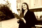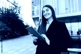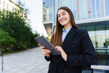 Confident Woman in Business Attire Engages With a Tablet Outside a Modern Office Building During a Sunny Day