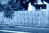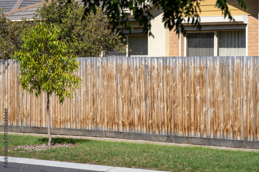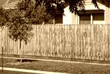 A wooden outdoor privacy fence with vertical slats stands alongside the footpath of a suburban house, marking the boundary of a garden or backyard in an Australian residential property.