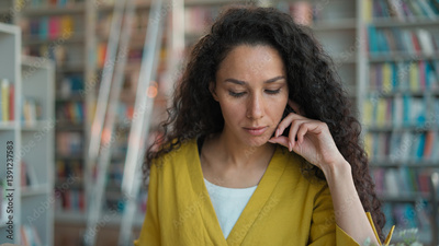Hispanic Arab Indian woman sitting reading book textbook page concentration girl female library student schoolgirl university college exam preparation lesson seminar learning study teenager knowledge