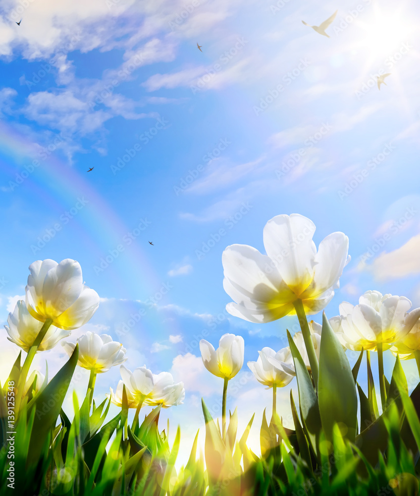 art Spring tulip flower on blue sky background; Happy Easter Day
