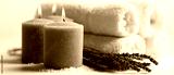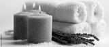A serene spa setup featuring lavender-scented candles, soft white towels, and sprigs of lavender, creating a calming atmosphere for relaxation.
