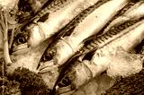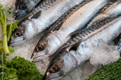 Mackerel fish on ice at the local market