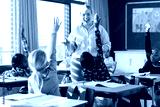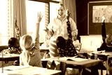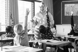In school, female teacher engaging with diverse students raising hands in classroom discussion