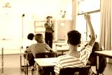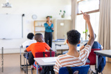 In school, student raising hand to ask question in classroom with Indian female teacher
