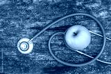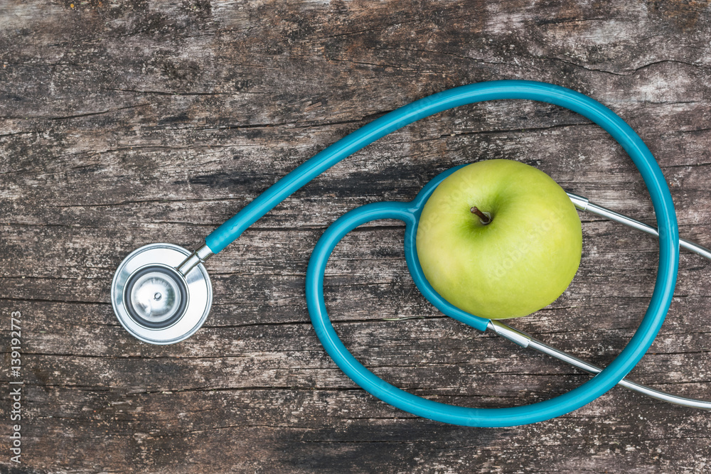 Green fresh organic natural nutrient AHA apple with doctor's stethoscope on grunge old aged wood background: World health day WHD symbolic conceptual design idea for healthy food