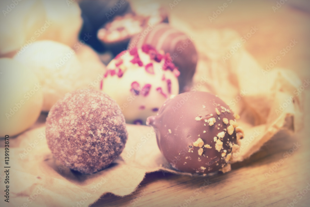 Selection of delicious chocolates on a rustic background