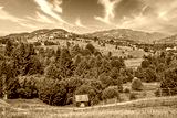 Carpathian mountains Europe, landscape in Romania, countryside trails , split rail fence, wooden house in summer